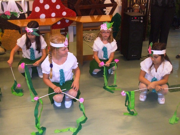 Dievčatá z tanečného krúžku predviedli svoje tanečné schopnosti hneď v úvode Imatrikulácie a otvorili túto veľmi milú slávnosť. Zelenú farbu sukniček prispôsobili dievčatá Jankovi Hraškovi, aby spolu ladili.